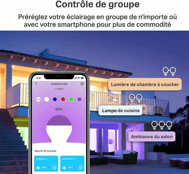 MULTICOLORES ET AJUSTABLES - Concevez facilement des scénarios pour vos habitudes quotidiennes ou vos activités spéciales en personnalisant la luminosité, la température de couleur (2 500 à 6 500 K) et les couleurs, avec un choix de 16 millions de couleurs