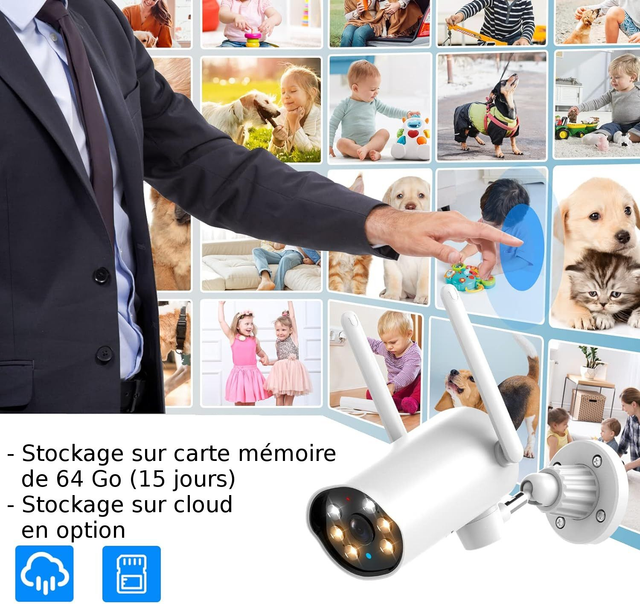 - Enregistrement sur une carte mémoire de 64 go inclus(15 jours), enregistrement sur cloud en option et payant.