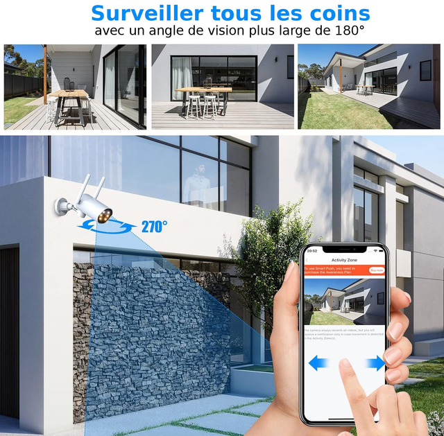 - Caméra grand angle de 90° fixe + de 180° en rotation soit un angle de vue total de 270°
